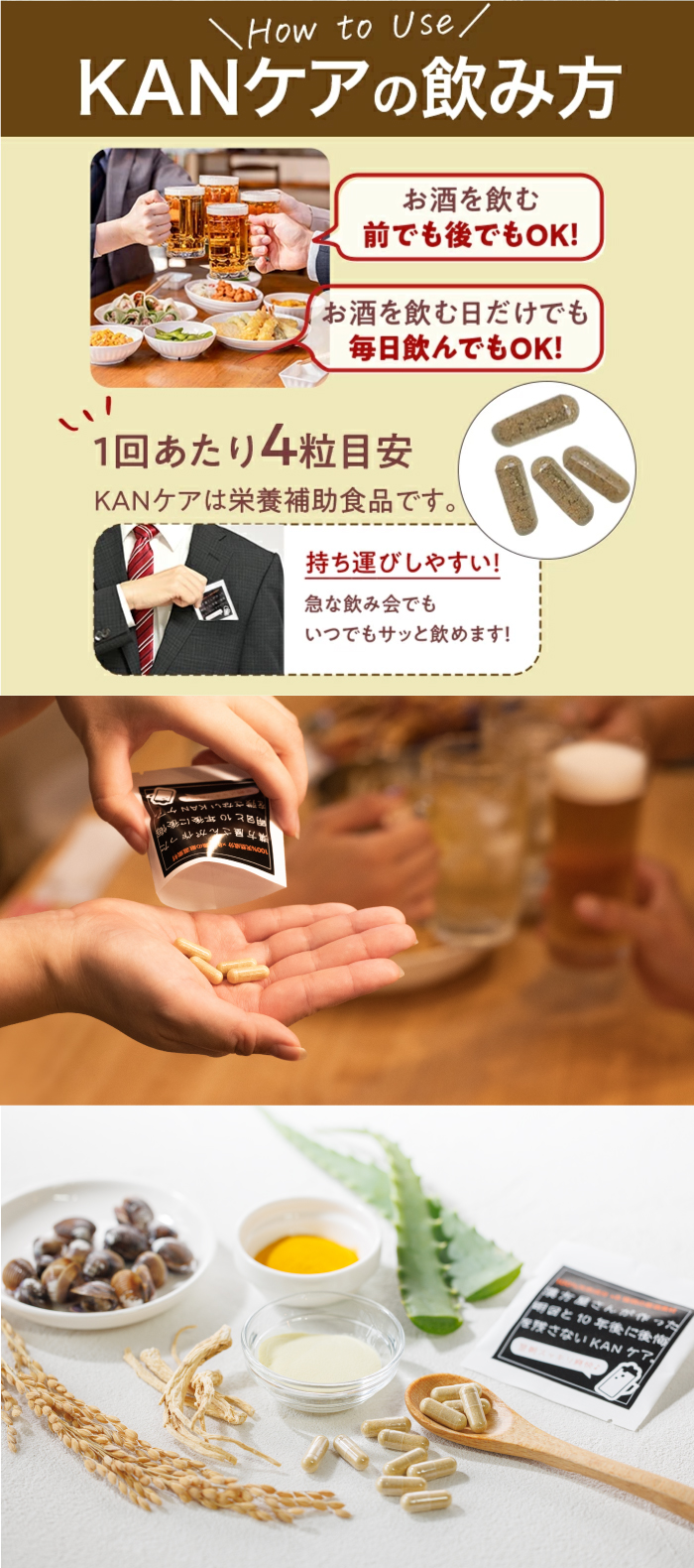 [お召し上がり方]お酒を飲む前、又は飲んだ後に1回4粒をお飲みください。お酒を飲まない日の体ケアや次の日朝から頑張りたいときの元気アップサプリとしてもオススメです!