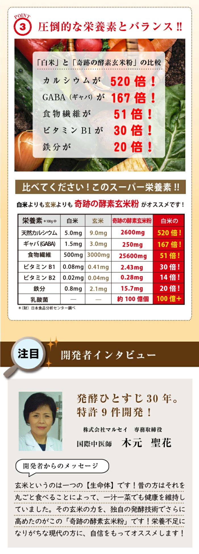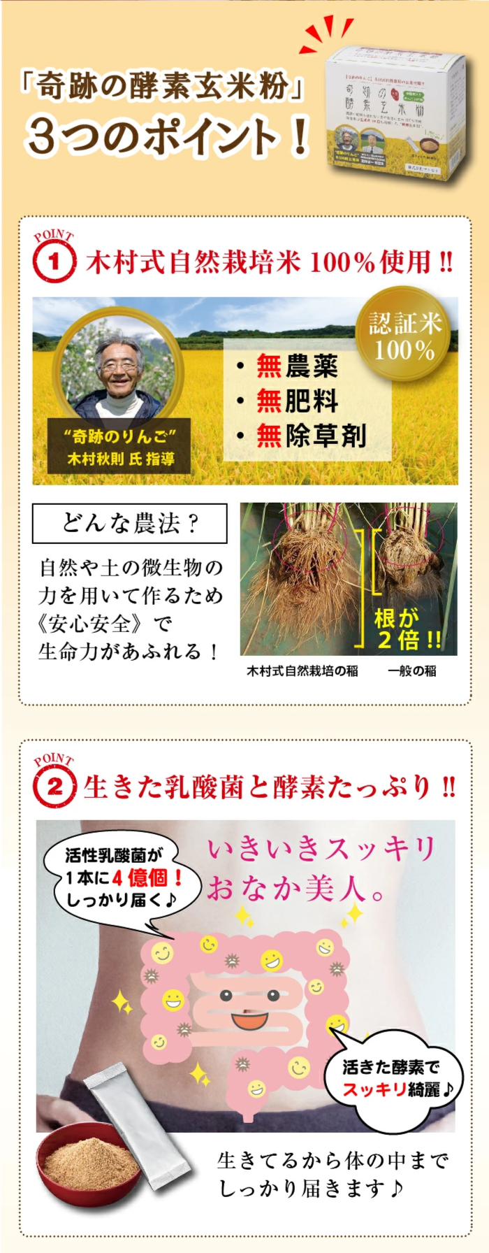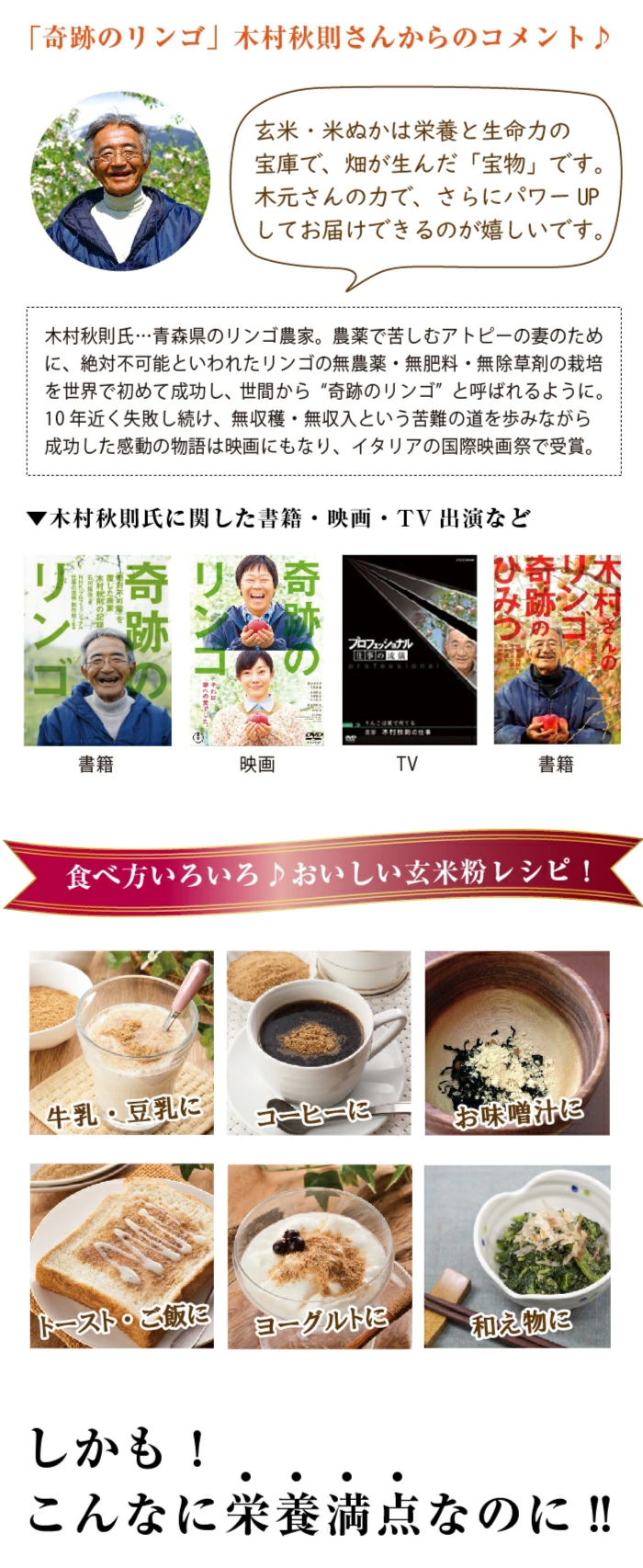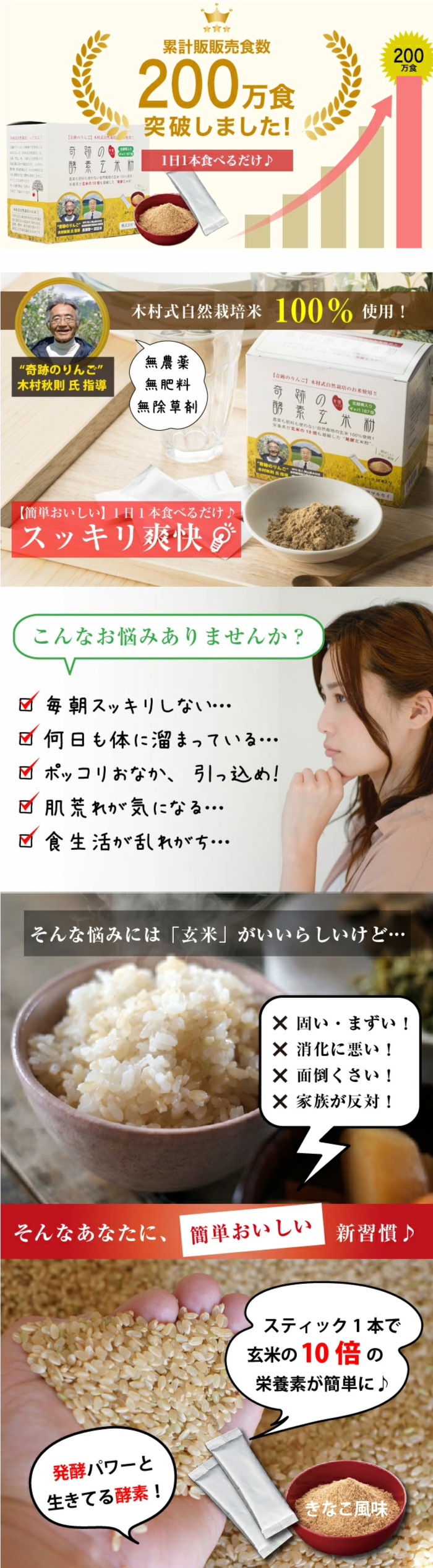 Top > 商品(全て) > 【発酵食品】マルセイHP表示用 > 奇跡の酵素玄米粉120g (4g×30本) 奇跡の酵素玄米粉120g (4g×30本) [200万食突破]奇跡のリンゴ木村さん直伝の自然栽培玄米を独自発酵した酵素玄米粉! 今すぐ購入・カート部分へ» ◆名称:玄米加工食品「奇跡の酵素玄米粉」 ◆内容量:120g(粉末スティック4g×30本) ◆原材料名:米ぬか(*国内製造)、発芽大麦、海藻カルシウム、有胞子性乳酸菌 *木村さん直伝、岡山県産の自然栽培玄米100%使用 ◆賞味期限:製造日より2年(箱・スティックに印字) ◆保存方法:直射日光・高温多湿を避けて保存 ◆召し上がり方:1日1本をそのまま、又は豆乳やヨーグルトに混ぜてお召し上がり下さい ◆販売価格:3,600円(税別)/3,888円(税込)/1か月分 通常購入 奇跡の酵素玄米粉120g(粉末スティック4g×30本) ¥3,600(税別) 数量 【会員様 36ポイント】