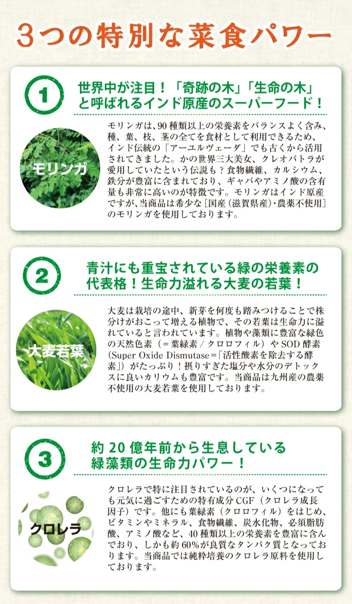 ●原材料名:米ぬか(国内製造)、マルチトール、モリンガ、クロレラ、大麦若葉、ビートオリゴ糖、海藻カルシウム、発芽大麦、有胞子乳酸菌