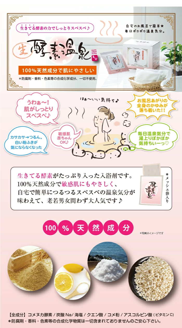 ●全成分:コメヌカ酵素、炭酸Na、海塩、クエン酸、コメ粉、アスコルビン酸(ビタミンC)