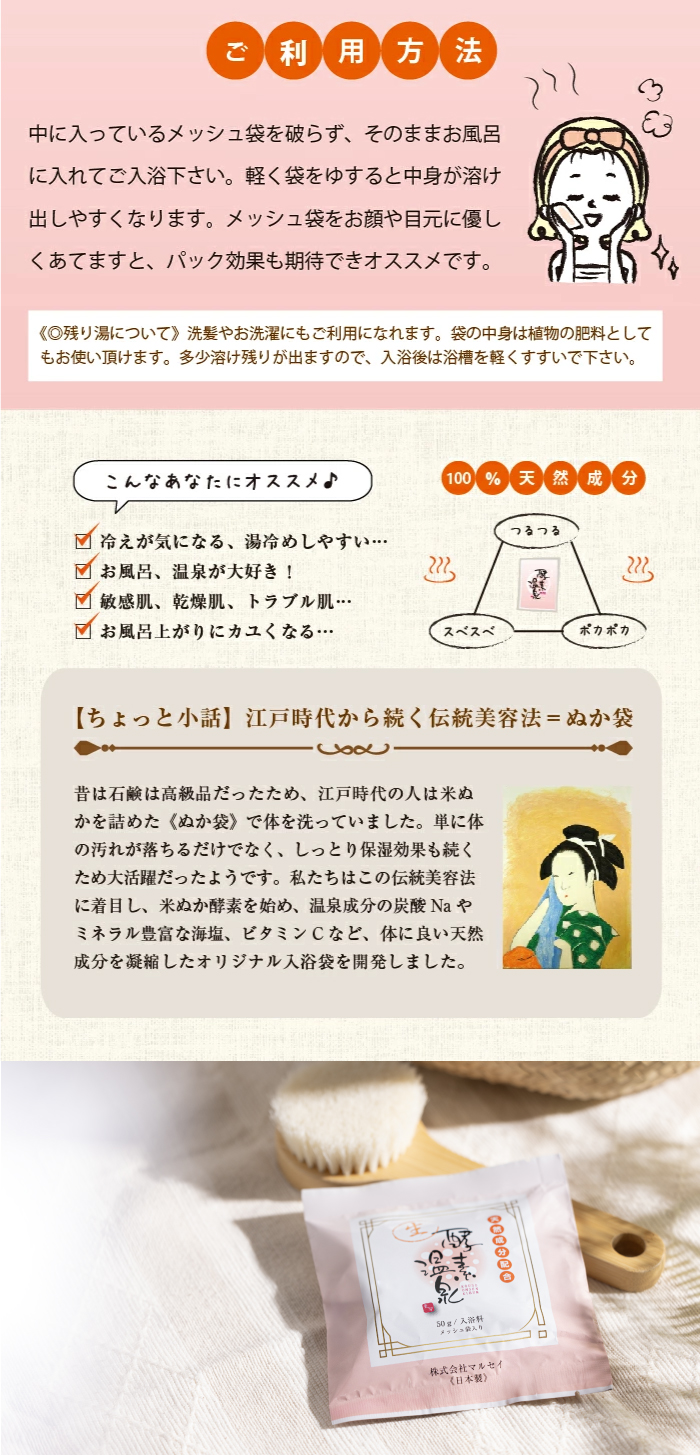 [ご使用方法]中に入っているメッシュ袋を破らず、そのままお風呂に入れてご入浴下さい。軽く袋をゆすると中身が溶け出しやすくなります。メッシュ袋をお顔や目元に優しくあてますと、パック効果も期待できオススメです。